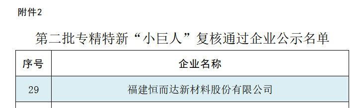 7月14日,福建省工業(yè)和信息化廳發(fā)布“專精特新‘小巨人’復(fù)核企業(yè)名單”結(jié)果公示,經(jīng)過嚴(yán)格的資格審查認(rèn)定,恒而達(dá)成功通過復(fù)核,再次獲得國家專精特新“小巨人”榮譽(yù)!