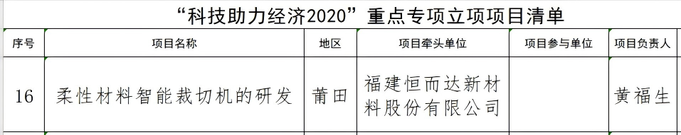 2020年6月28日,福建省科學技術廳發(fā)布關于批復“科學助力經(jīng)濟2020”重點專項項目立項的通知,我司組織申報的《柔性材料智能裁切機的研發(fā)》項目列入國家重點研發(fā)計劃“科技助力經(jīng)濟2020”重點專項,該項目是公司自主創(chuàng)新并獨立承擔的研發(fā)任務。