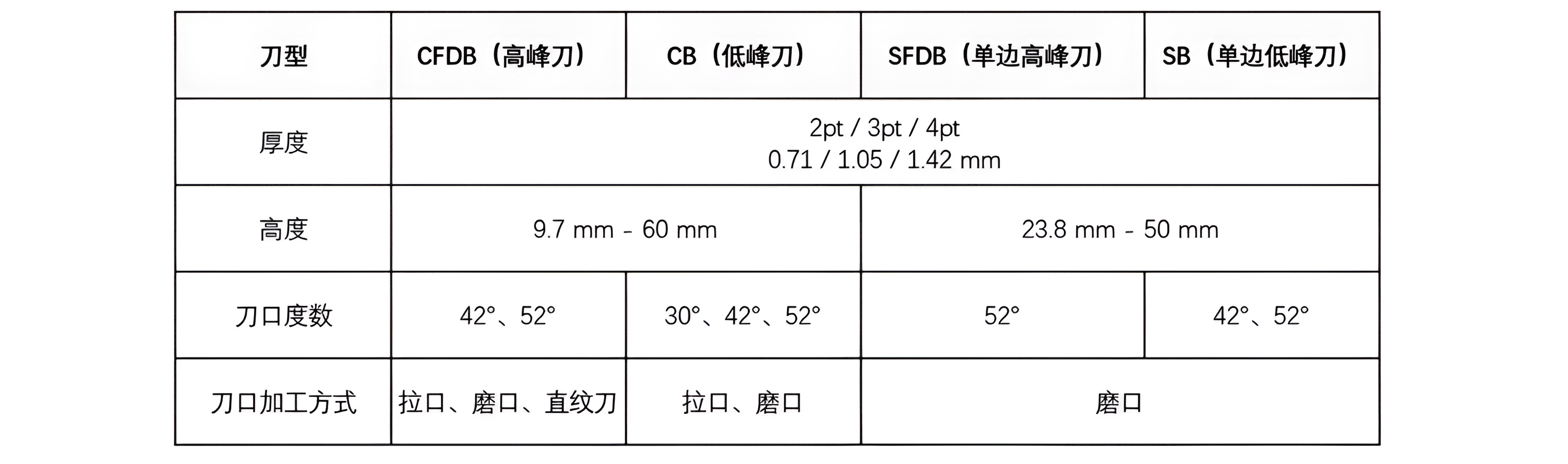 CFDB(高峰刀), CB(低峰刀)等為模切刀產品中的流行款型。刀口經過硬化處理更鋒利,刀體折彎性能優(yōu)秀,使用壽命長。